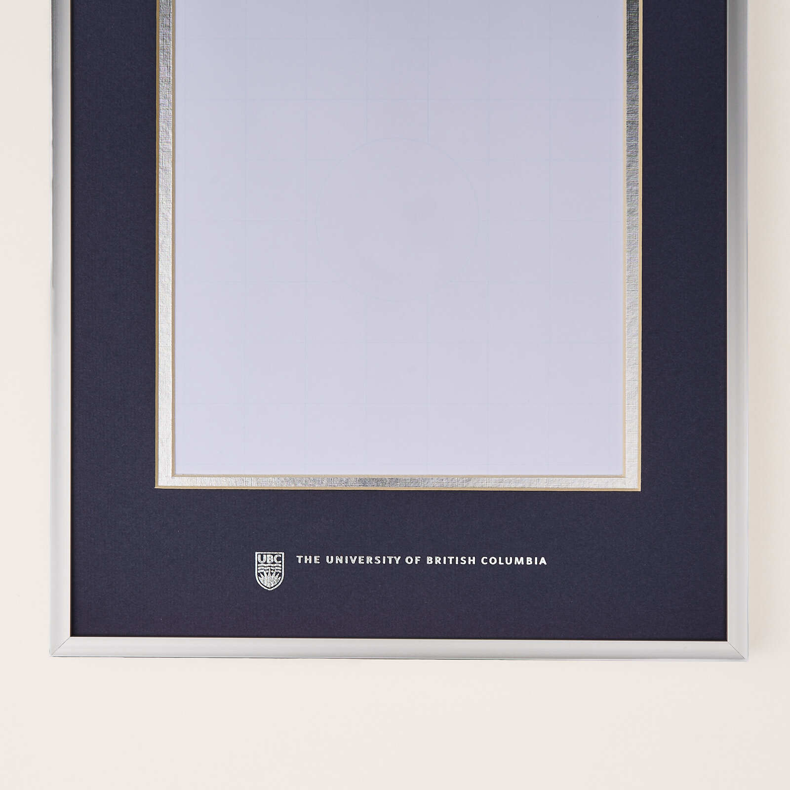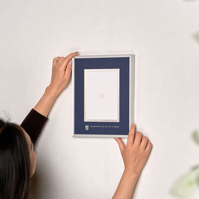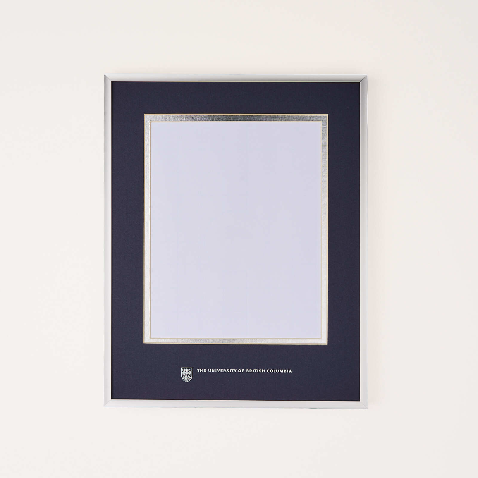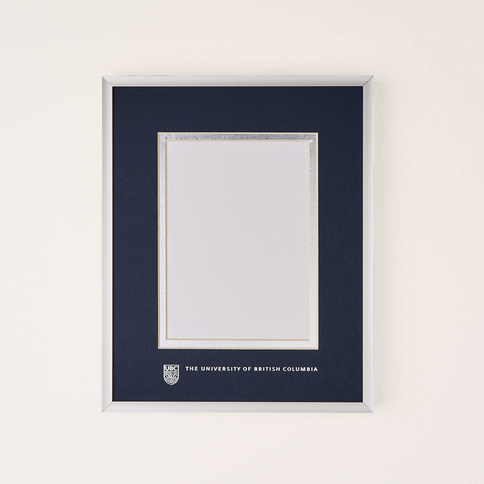 This simple but elegant silver metal photo frame features navy and silver double matting with the UBC crest and logo embossed in silver foil.