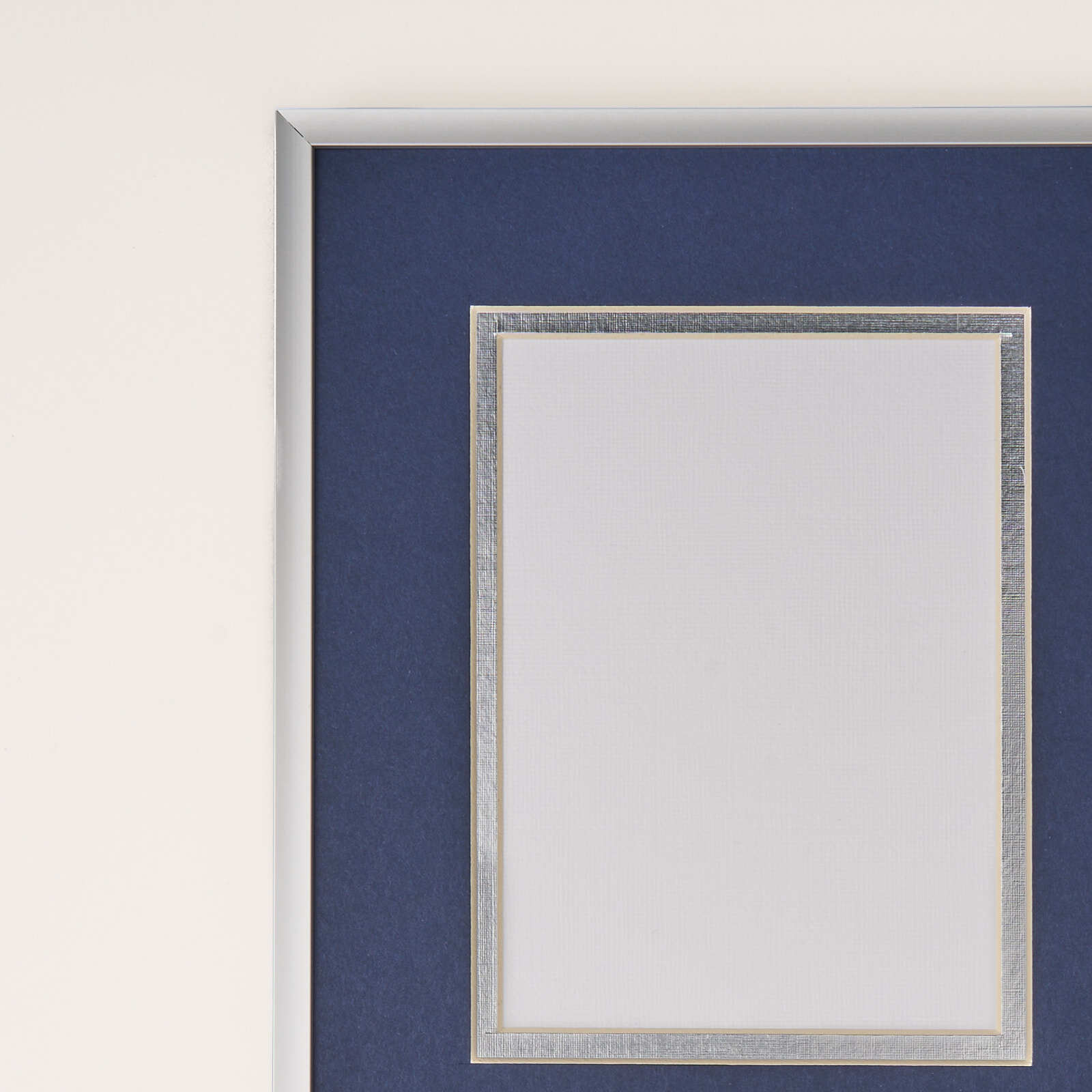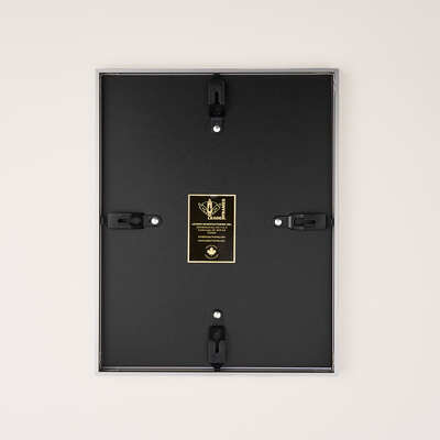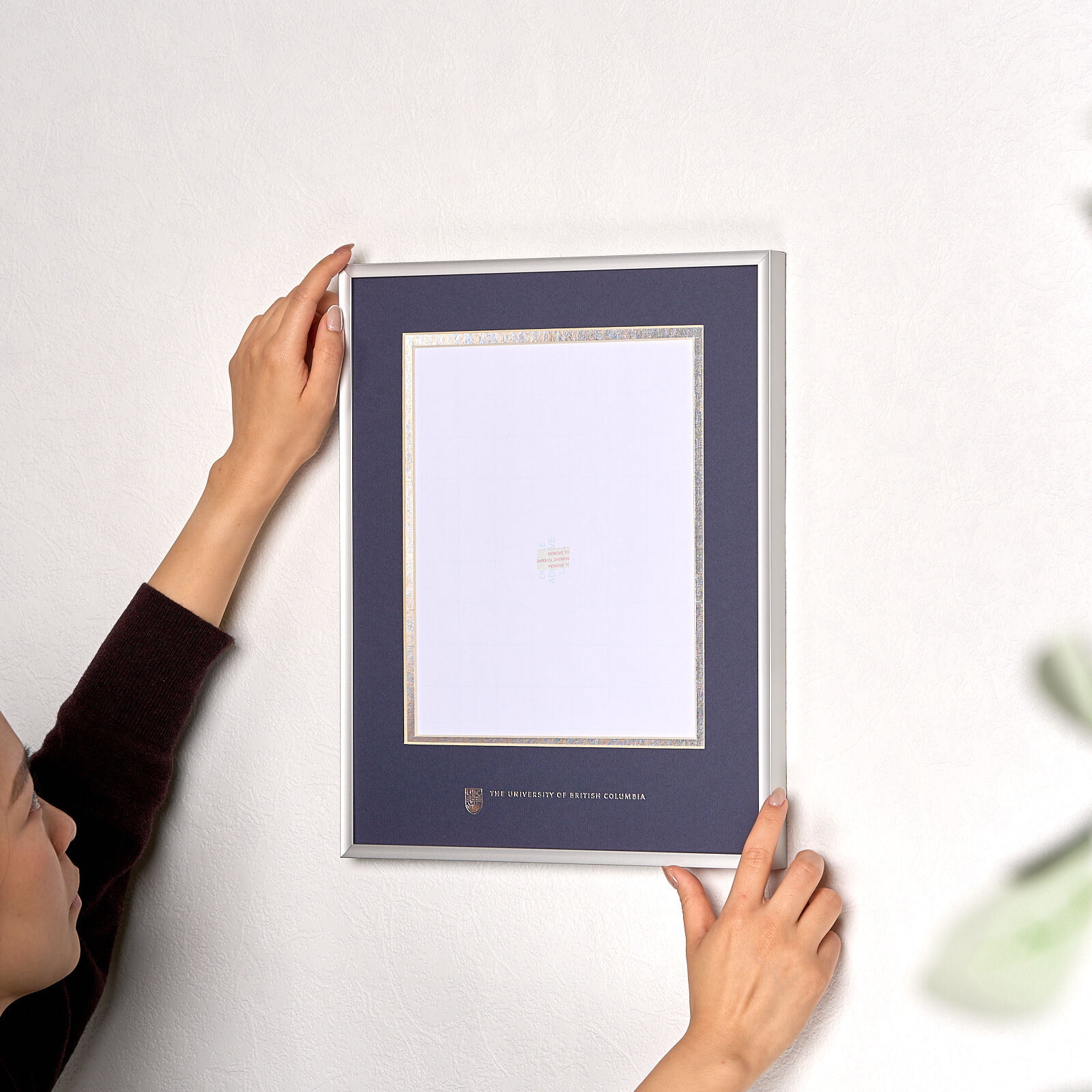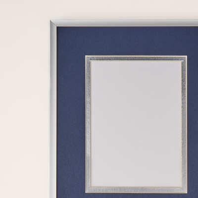 This simple but elegant silver metal photo frame features navy and silver double matting with the UBC crest and logo embossed in silver foil.